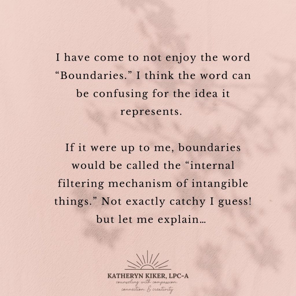 I think the word boundary alludes to a blockade or a fence. So even in mental health where we are discussing intangible things it can be easy to assume it’s saying to physically block things or people out of your life. But when I describe it like this filtering mechanism, I realize it’s my internal decisions that make impact on my life and by extension the world around me.
